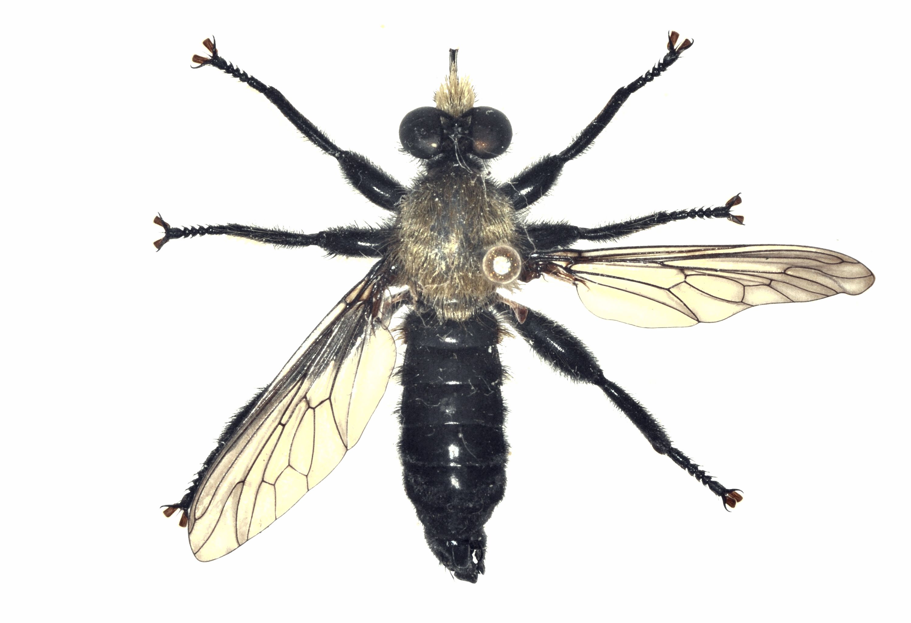 As an aside, the reason Laphria like this look hunchbacked, at least in cropped head photos, is that when they die, the head is reflexed with respect to the thorax, much as is the case with fossil birds and small bipedal dinosaurs, and one would think at first for the same reason, namely the contraction of doral neck muscles. Because of this flexure, to get a side shot of the head with the eyes facing forward, as when the fly is airborne, the body has to be oriented at a considerable angle. Hence the hunchbacked look. However, in life, at rest, as for example on a horizontal surface of a fallen log, and more particularly in the smaller species when sitting head-down on the trunk of a tree, the head is also equally strongly reflexed. In fact, this reflexed position might be considered normal.