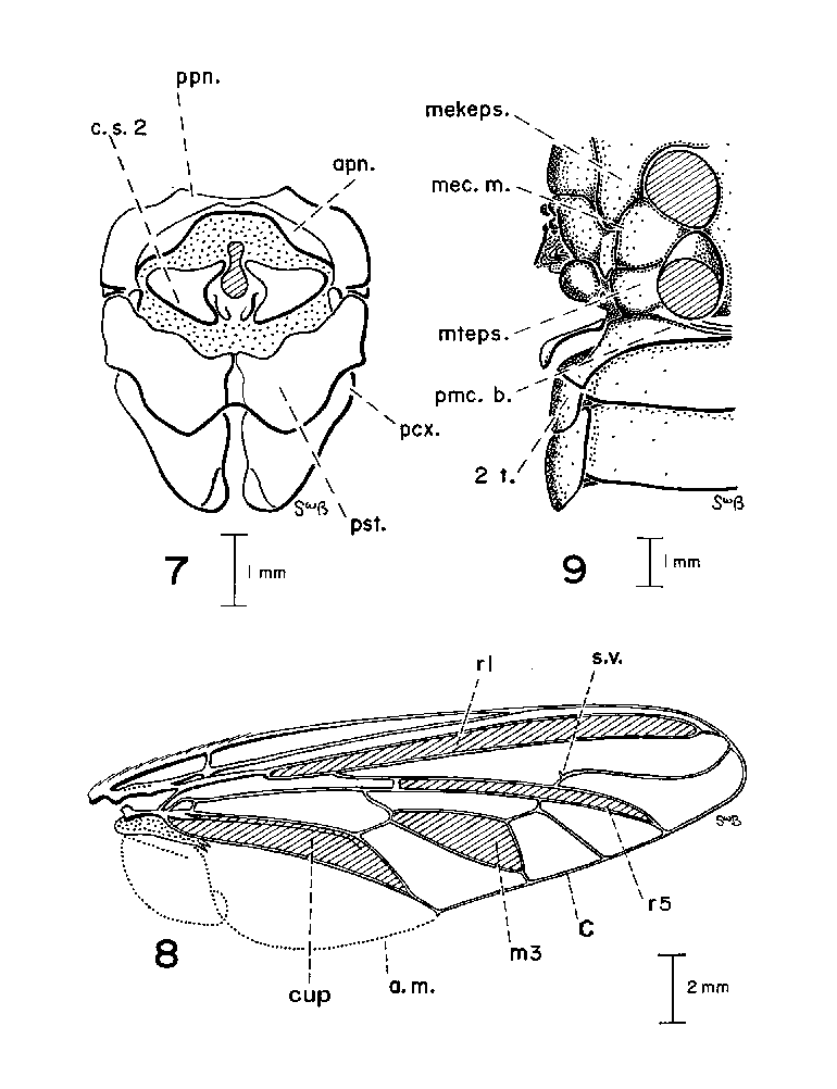 7. prothorax, excepting postpronotal lobes and cervical sclerites, anterior view; 8. right wing, dorsal view; 9. post-metacoxal bridge and associated structures, ventral view;. Terms: a.m., anal margin; cup, cell cup; apn., antepronotum; C, costa; c.s. 2, cervical sclerite 2; r1, cell r1; mec. m., mesocoxal meron; mekeps., mesokatepisternum; mteps., metaepisternum; pcx., procoxa; pmc. b., postmetacoxal bridge; ppn., postpronotum; pst., prosternum; s.v., stump vein; r5, cell r5; m3, cell m3; 2 t., second abdominal tergite.