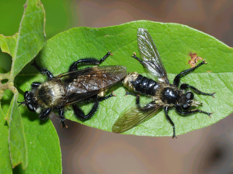 Laphria divisor (Banks), Mating pair on upper surface of leaf. Skyline Drive, Shenandoah National Park. Madison Co., VA, July 12, 2009. Identified from photo by Walter P. Gould.