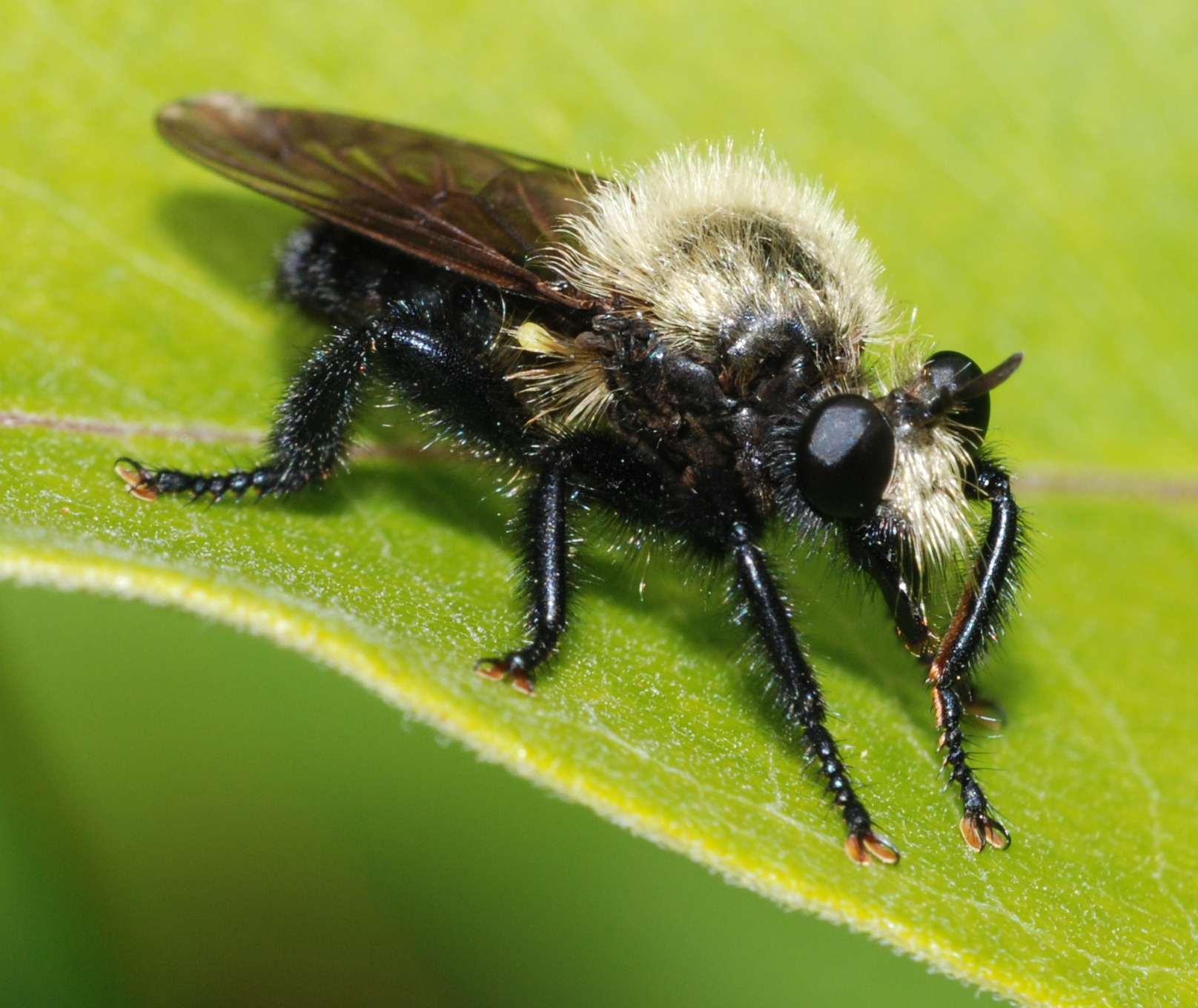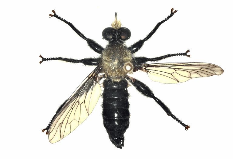 An adult Laphria. Fly is about an inch long. The hairy black and yellow robber flies of the genus Laphria are an insect collectors dream. The adults are large, fast, and fun to capture. They are also some of the showiest North American flies. The genus was described by Meigen in 1803, based on a European type, and is now considered to be Holarctic in distribution. Thirty described species or subspecies are found in North America, all north of Mexico. There are also several undescribed species in the United States. The North American members of the genus are peculiar because most of the adults superficially resemble bumble bees, and even sound the same when flying. Furthermore, many of the larger species regularly include bumble bees as part of their diet.