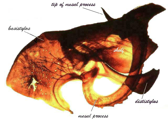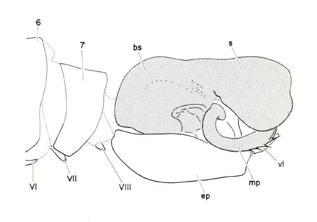 Outline drawing of the male terminalia of Laphria gibbosa (Linnaeus). This European species is the designated "type" of the genus, that is, the standard to which all the other species are compared. The view is from the left side, meaning the posterior end of both the fly and its terminalia is on the right. Roman numerals refer to abdominal sternites (the bottom part of a segment), arabic numerals to tergites (the top part of a segment). There are two gonopods, one one each side of the fly. Each is sudivided into three parts, the basistylus (bs), the dististylus (hidden behind the shelf of the basistylus), and the mesal process (mp). Only the basistylus and its mesal process are labelled here. The large shelf of the basistylus (s) is characteristic of this genus. The 9th terghite or epandrium (ep) and ventral lamellae (vl) are also labelled. Note that 1) the 9th and succeeding segments of the abdomen are rotated 180 degrees, that is, flipped upside down, and 2) there is no 9th sternite. This arrangement is characteristic of Laphriini in general. The twisting of the abdomen is is responsible for the reduction of the eight segment, which when everything is retracted, is normally hidden from view. As I mentioned, Laphria s. str. is Holarctic in distribution. In addition to being found across North America, they occur from the Bristish Isles, across Europe and Asia, to Japan. Many of the Palearctic species also look somewhat like bumble bees, but others present a more wasp-like aspect. Both L. saffrana the North American Bombomima types are united with these European Laphria in having a peculiar type of gonopod, or "clasper." There are two of these gonopods, and what makes them unique is the large shelf-like flange that covers each side, and forms what amounts to a box around the aedeagus (see drawing above, and photo below). This extreme development of a flange is not found in any of the other genera. In the North American species the posterior margins of the flanges are often very irregular in outline, or "notched."
