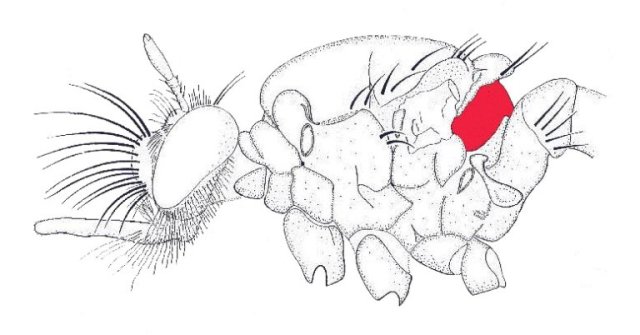 Head, thorax, and first abdominal segment of a laphriine fly, left lateral view. The wings have been clipped off, and the legs except for the bases or coxae have been removed. The sclerite shaded in red forms a strap-like collar that runs across the back of the thorax , more or less connecting the two halteres. This sclerite consists of a central mediotergite, which is completely fused on each side with an anatergite. Although there is no suture demarcating the limits of the two sclerites, the anatergites can be considered to be the lateral, somewhat raised portions of the complex. In North American Laphria s. str. these anatergites bear hairs and/or bristles. According to Hull these hairs are absent in European Laphria.